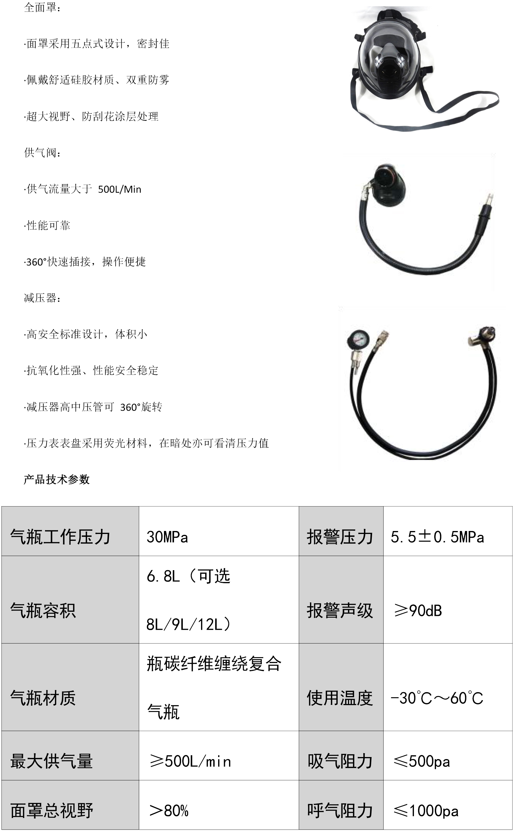 产品简介:正压式空气呼吸器(以下简称呼吸器),其主要用于消防、化工、石油、冶金、船舶、矿山、试验室、油库、仓库等部门抢险、救灾等。供消防队员或抢险救灾人员在烟雾、有毒气体、粉尘或缺氧的环境中安全有效地进行灭火、抢险、救灾和救护工作。