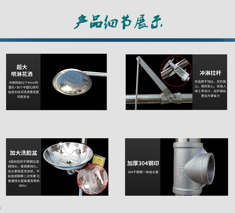产品简介:洗眼器是当发生有毒有害物质(如化学液体等)喷溅到工作人员身体、脸、眼或发生火灾引起工作人员衣物着火时,用于紧急情况下,暂时减缓有害物对身体的进一步侵害,进一步的处理和治疗需要遵从医生的指导,避免或减少不必要的意外。
